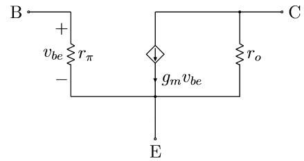 The hybrid model is a linearized two-port network approximation to the BJT using the small-signal base-emitter voltage, , and collector-emitter voltage, , as independent variables, and the small-signal base current, , and collector current, , as dependent variables.