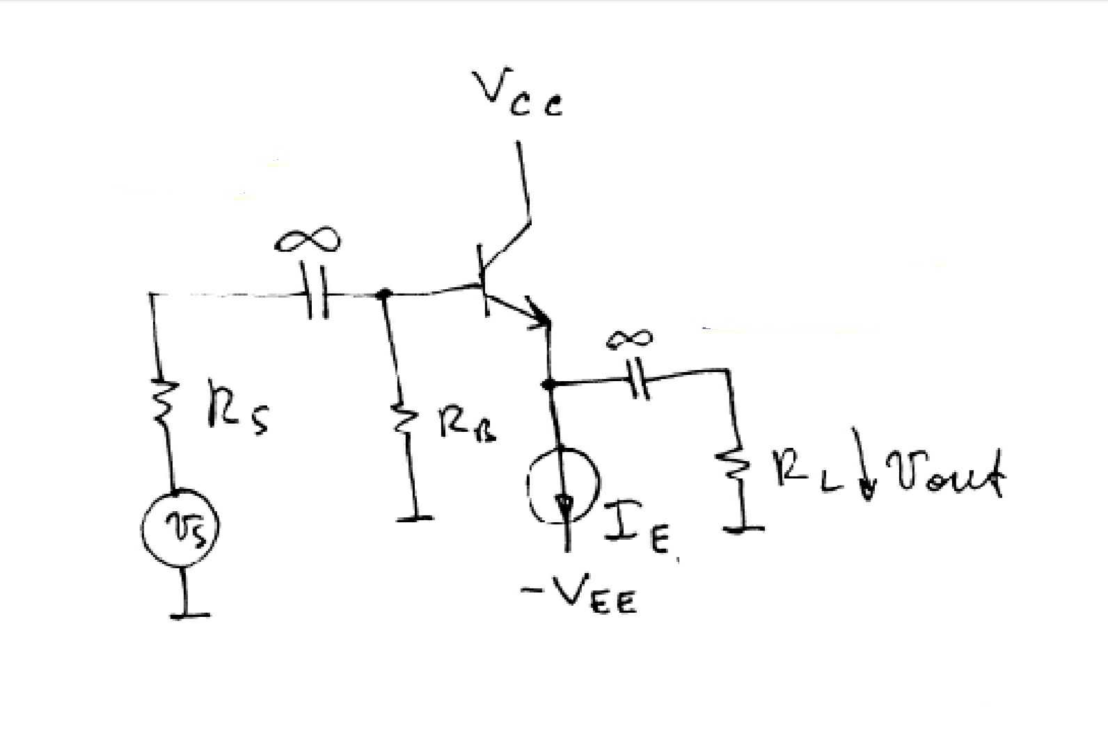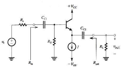 The circuit of the CC configuration is shown below in figure 2. Since the collector is to be at signal ground, the collector resistance is removed. The input signal is capacitively coupled to the base, the output signal is capacitively coupled from the emitter to a load resistance . [3]